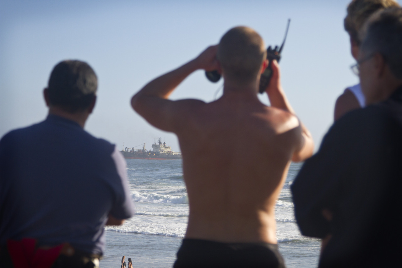 Paramedics, firefighters, surf rescue, and beach patrol personel look on after onlookers reported a ship aground at Ocean Beach, San Francisco near Sloat Blvd Friday July 1, 2011. According to bystanders the ship was close to tipping over on the sand bar, eliciting the full response of San Francisco’s surf rescue personel. The ship managed with dislodge its hull from the sand bar without further incident. Jon Weiand