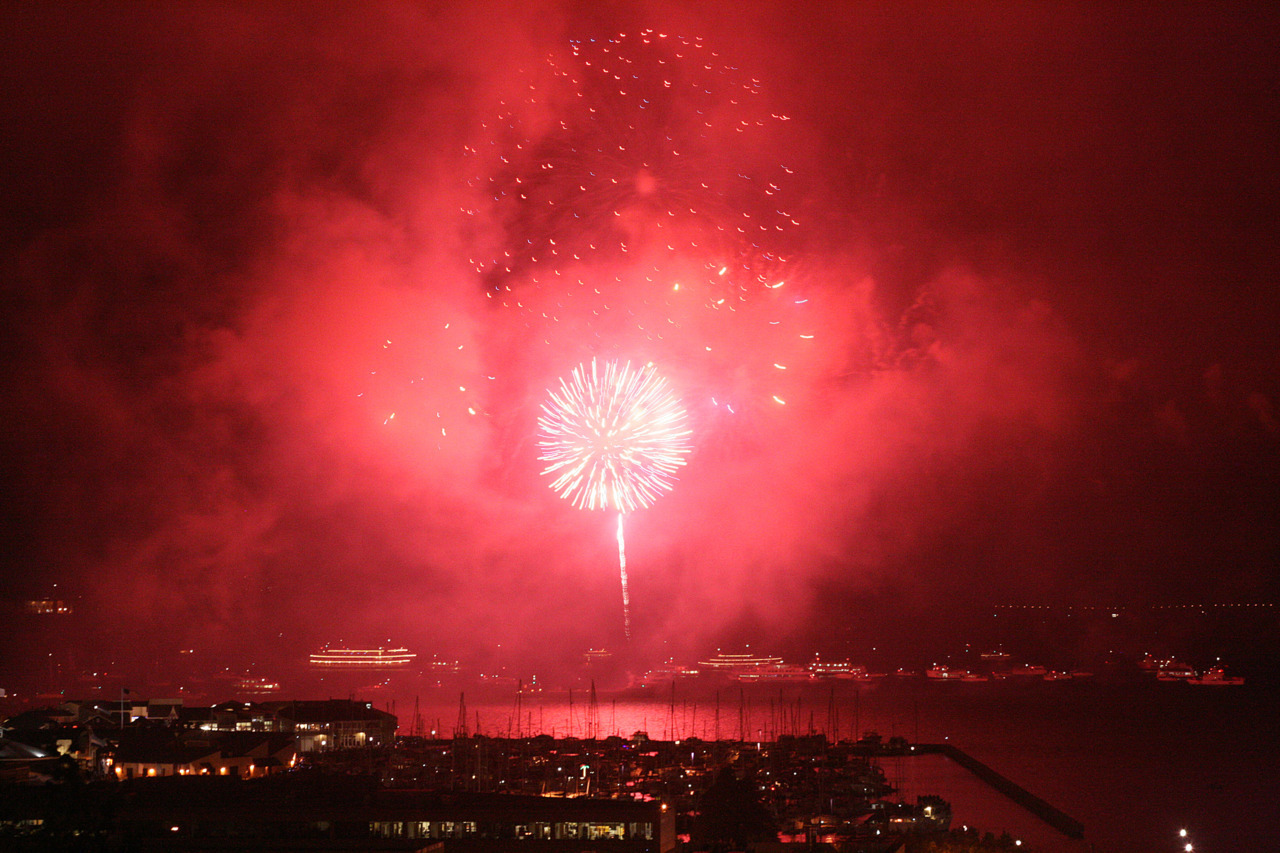 Fireworks from the 4th of July in 2009, near Coit Tower overlooking Alcatraz, the Bay, and Pier 39 in San Francisco.