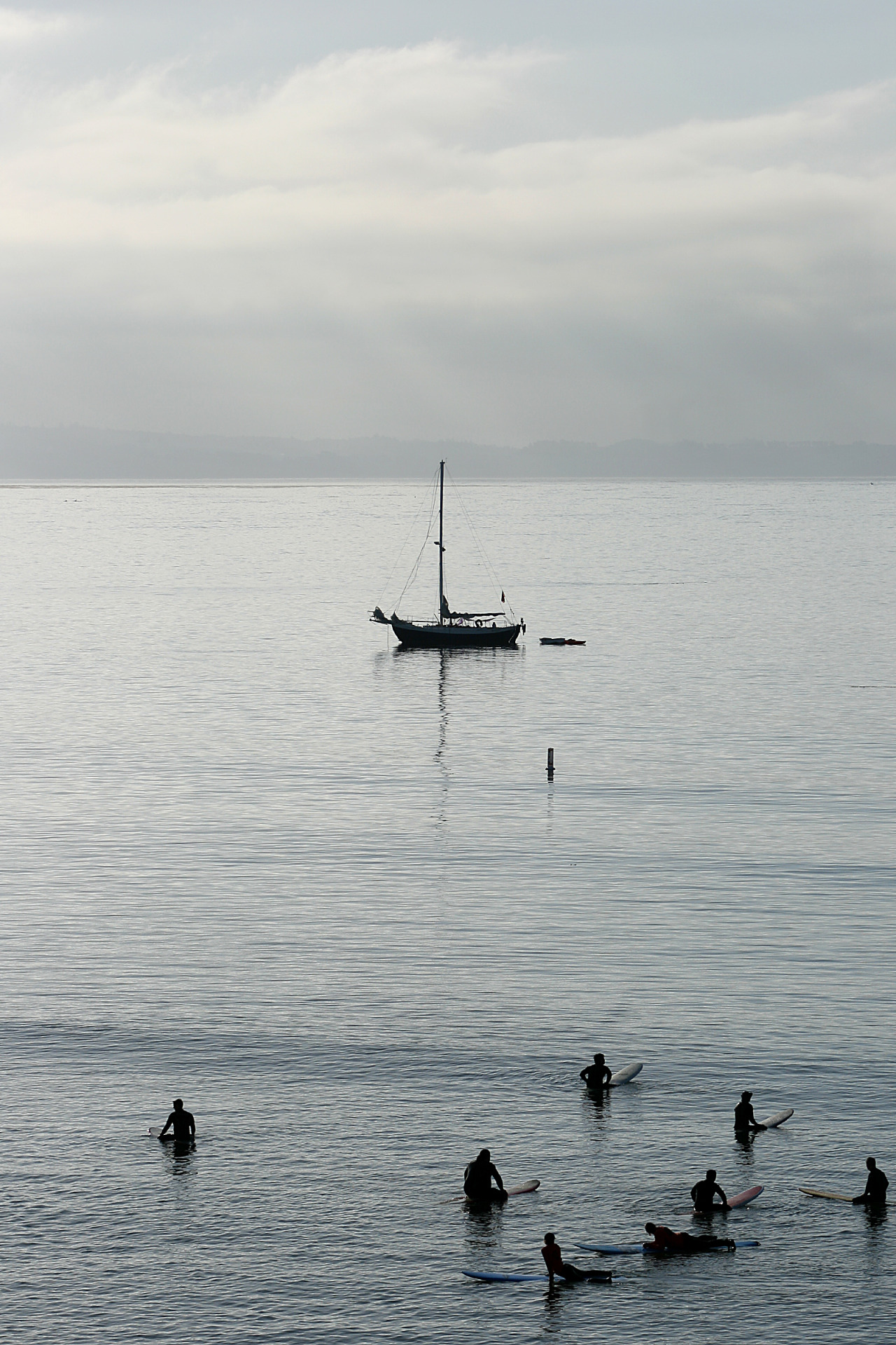 Surfers wait for the next set at Cowell’s Beach in Santa Cruz.