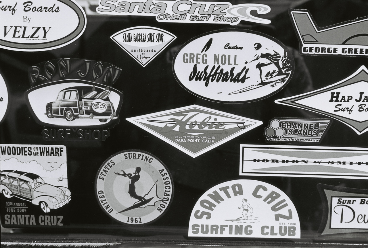 Surfing stickers posted on a Woodie at the Woodies on the Wharf car show in Santa Cruz.