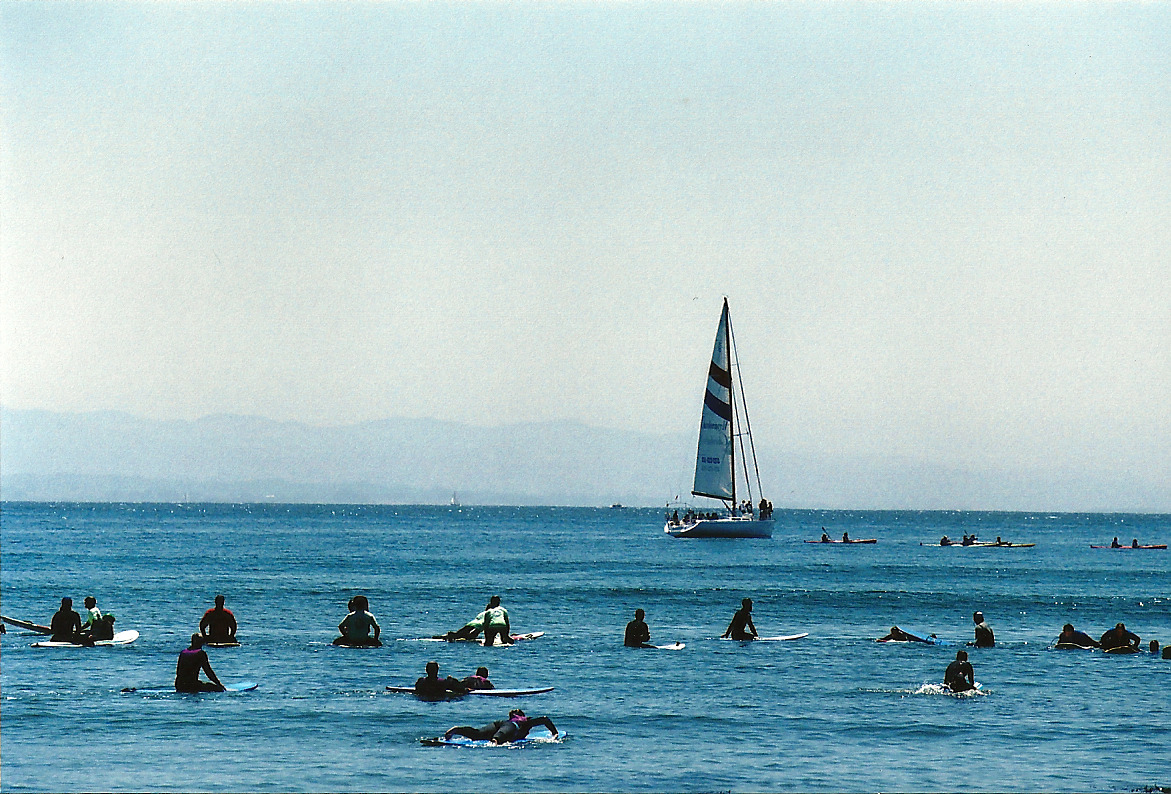 Surfers waiting for the next set at Cowells in Santa Cruz.
